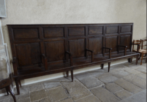 On sait ainsi qu’en avril 1819, deux bancs ont été faits pour l’église par Jean-Baptiste Valière, menuisier, pour la somme de 18 francs. Un serait pour la Fabrique, l’autre pour la Municipalité. Ce sont ceux qui sont encore dans le chœur de l’église. Faits pour l’emplacement qu’ils occupent, ils sont solides en chêne noirci par le temps, l’encaustique et les cierges. L’un à six places, l’autre quatre ayant été raccourci. A dossier droit, plein, de 5.5 cm d’épaisseur, ils mesurent respectivement 3.90 m de long et 2.60 m pour 1.40 m de hauteur totale. Ils sont divisés par des accoudoirs – chaque place mesure 0.56 m de large pour 0.32 m de profondeur à 0.42 du sol – les pieds extérieurs sont massifs, carrés, avec les côtés chanfreinés, les quatre pieds intérieurs sont ou carrés ou rétrécis dans le bas. Chaque place a son dossier particulier avec un bandeau rectangulaire allongé à la hauteur de la tête et un autre carré au-dessous. Le bandeau supérieur du banc est d’une pièce : 3.90 m. On est bien assis.