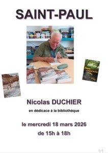 Nicolas DUCHIER dédicacera ses ouvrages le mercredi 18 mars à la bibliothèque de Saint-Paul, de 15h à 18h.
