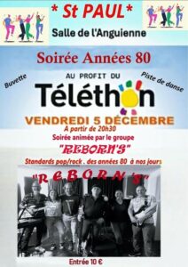 Soirée « Années 80 » animée par le groupe Reborn’s à partir de 20h30 à la salle des fêtes de Saint-Paul, le vendredi 5 décembre.